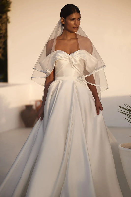 CIVAN Bridal Satin A-Line Wedding Dress with Off Shoulder Bow & Veil – Custom Made Bridal Gown