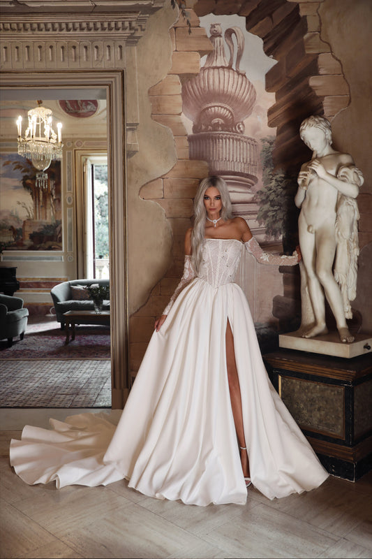 CIVAN Bridal Elegant Mikado Ballroom Wedding Dress with Open Shoulders and Slit – Custom Made Bridal Gown