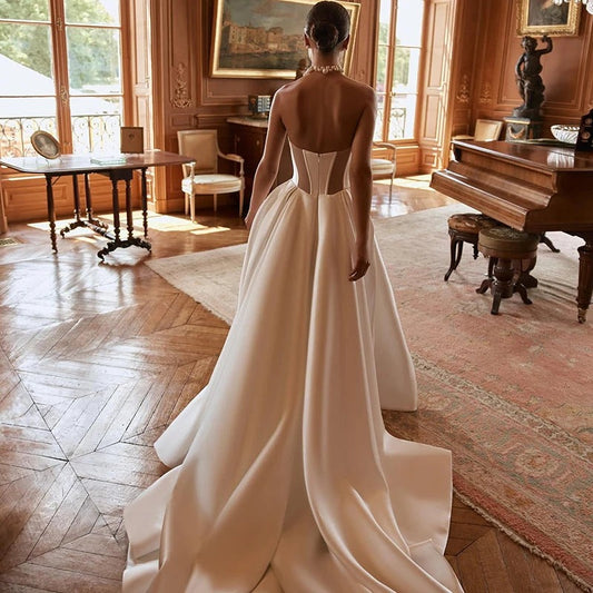 Beaded Corset Satin Wedding Dress with High Slit Elegant Bridal Gown